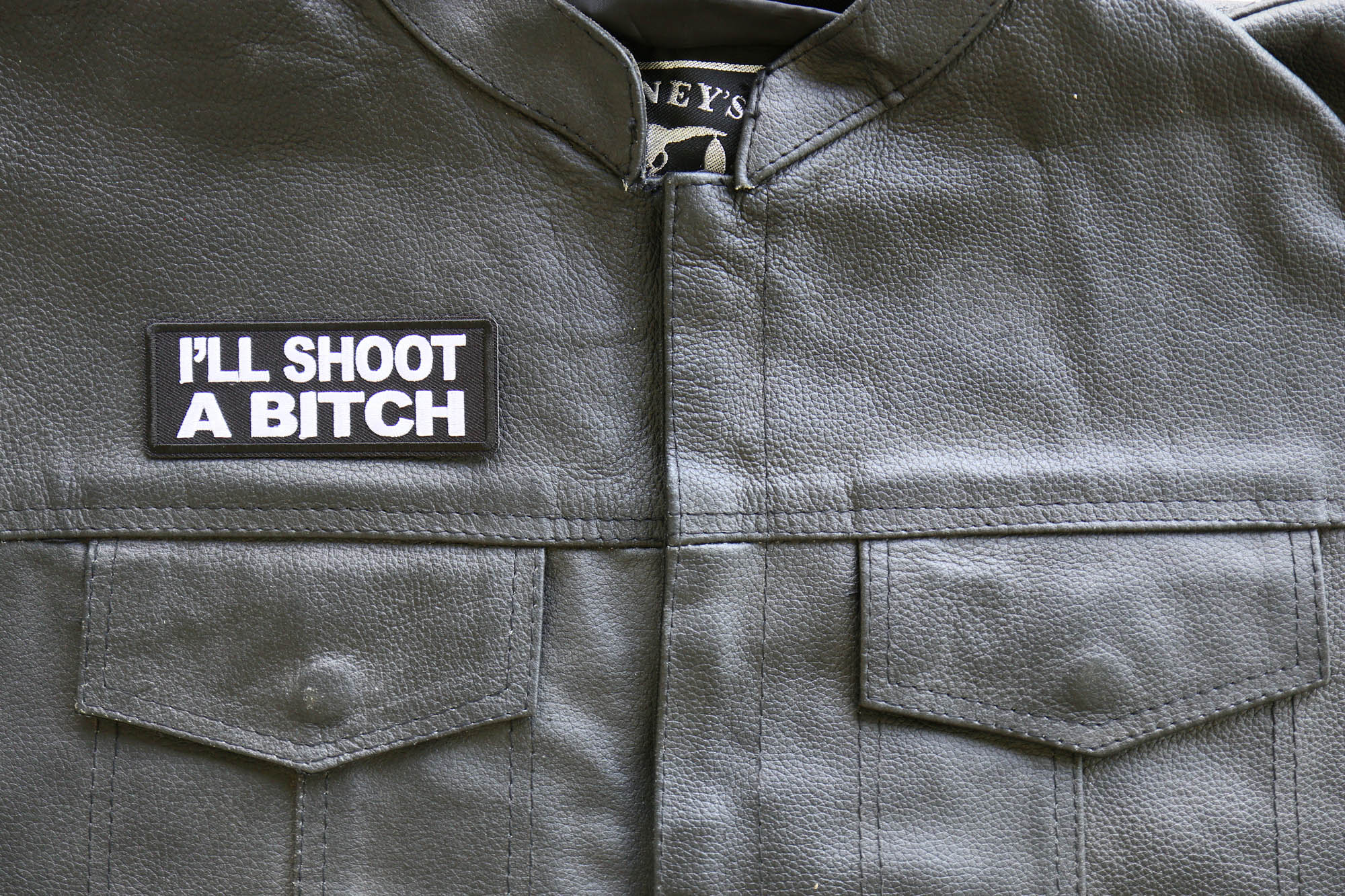 I'll Shoot a Bitch Iron on Patch measures 4x1.5 inches and is Embroidered in Black / White. The patch can be sewn on to Leather Biker Jackets, Vests or Chaps. The patch can also be ironed on to Shirts, Hats or Denim material such as Jeans. Features plastic iron on backing and clean laser cut embroidered borders. Japanese made iron on glue requires temperature between 270-290 Degrees Fahrenheit. Use a heat press for 30 seconds to adhere the patch permanently to your clothing. Using a regular household iron will probably not be as permanent as one hopes. If possible we recommend you sew on your patches for a more durable application. Never iron on patches to Leather or Nylon materials.
