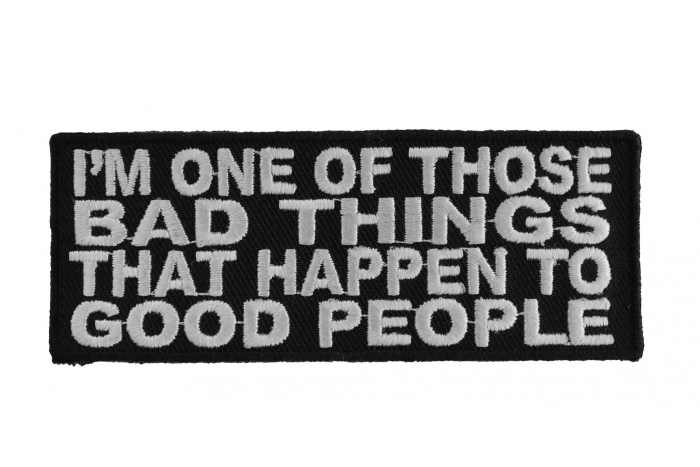 I'm One of Those Bad Things That Happen to Good People Patch measures 4x1.5 inches and is Embroidered in Black / White. The Small Patch can be sewn on or ironed on to clothing such as Denim or Leather Jackets, Vests, Hats, Back Packs, Shirts. Features plastic backing and embroidered die cut borders.