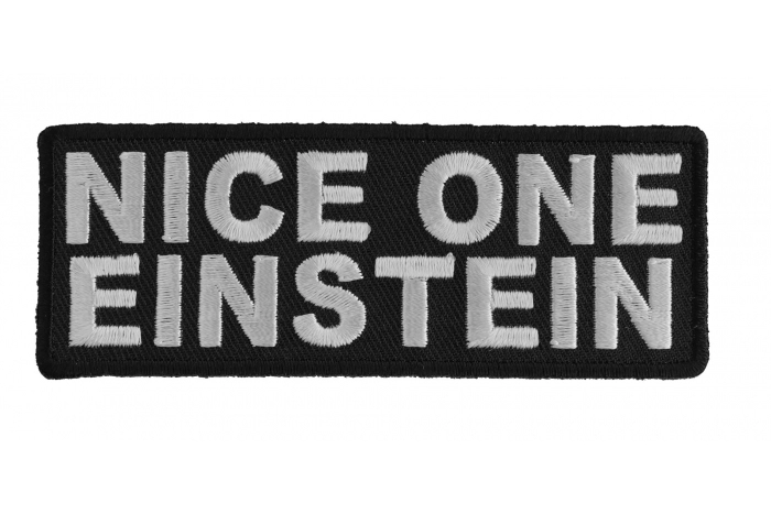 Nice One Einstein Funny Iron on Patch measures 4x1.5 inches and is embroidered in Black / White. The patch can be sewn or ironed on.. Never iron on patches to leather or nylon material. We wholesale these patches if you are interested in becoming a reseller inquire for wholesale.