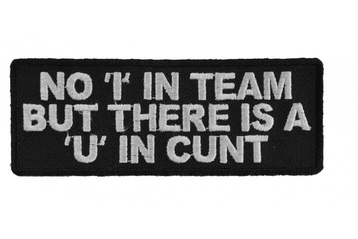 No I in Team by there is a U in Cunt Patch is embroidered in Black / White. Measures 4x1.5 inches. The patch can be sewn or ironed on. Do not iron on patches to leather or nylon material. Buy them cheaper with a wholesale account. Resell them on Ebay.