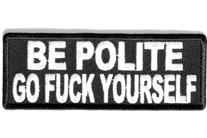 Be Polite Go Fuck yourself patch is embroidered in white and measures 4x1.5 inches.