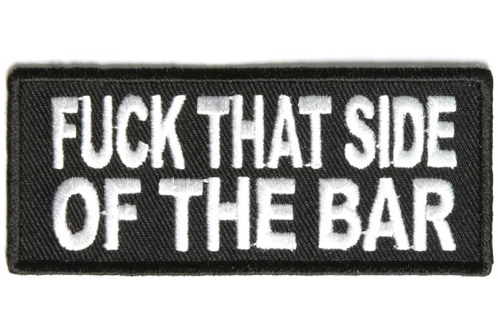 This fun patch says Fuck that side of the bar. Embroidered in white over black the patch measures 4x1.5 inches.
