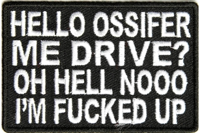 This hilarious funny patch says "Hello Ossifer, Me Drive, ohh hell no, I'm fucked up". The iron on patch measures 2.5x2 inches. Embroidered in white over black twill.