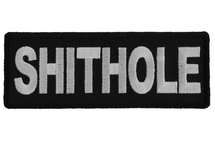 Shithole Patch measures 4x1.5 inches and is Embroidered in Black / White. The Small Patch can be sewn on or ironed on to clothing such as Denim or Leather Jackets, Vests, Hats, Back Packs, Shirts. Features plastic backing and embroidered die cut borders.