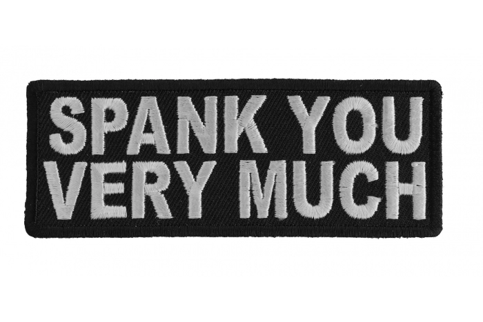 Spank you Very Much Patch measures 4x1.5 inches and is Embroidered in Black / White. The Small Patch can be sewn on or ironed on to clothing such as Denim or Leather Jackets, Vests, Hats, Back Packs, Shirts. Features plastic backing and embroidered die cut borders.