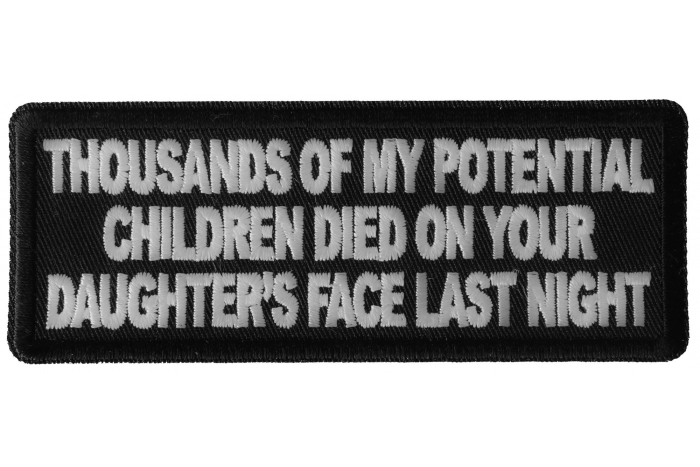 Thousands of My Potential Children Died on Your Daughter's Face Last Night Patch measures 4x1.5 inches and is Embroidered in Black / White. The Small Patch can be sewn on or ironed on to clothing. You should sew patches on to leather jackets or vests. Refrain from ironing on patches to nylon or leather material. The correct iron on temperature is 270 degrees Fahrenheit. If you are using a household iron you should press down for 30 seconds. If you are using a heat press 12 seconds is sufficient. The patch features clean cut embroidered borders