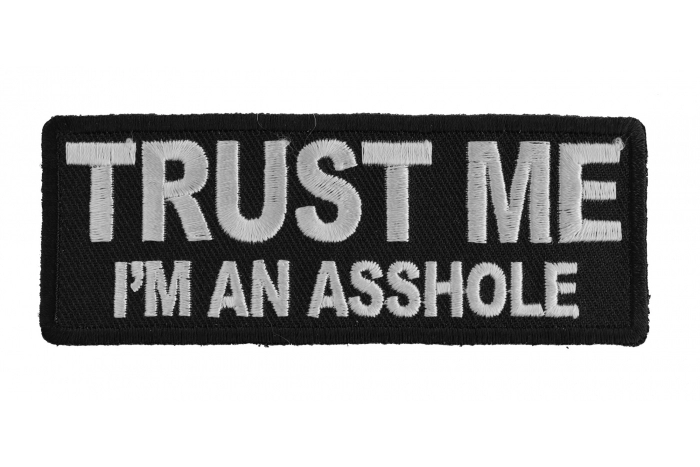 Trust Me I'm an Asshole Patch measures 4x1.5 inches and is Embroidered in Black / White. The Small Patch can be sewn on or ironed on to clothing such as Denim or Leather Jackets, Vests, Hats, Back Packs, Shirts. Features plastic backing and embroidered die cut borders.