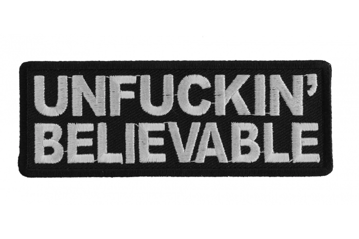 Unfuckin Believable Patch measures 4x1.5 inches and is Embroidered in Black / White. The Small Patch can be sewn on or ironed on to clothing such as Denim or Leather Jackets, Vests, Hats, Back Packs, Shirts. Features plastic backing and embroidered die cut borders.