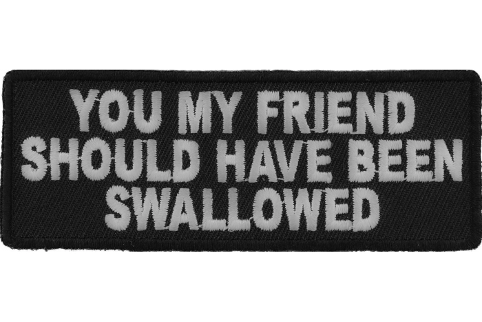 You My Friend Should Have Been Swallowed Funny Iron On Patch measures 4x1.5 inches and is embroidered in Black / White. The Patch can be sewn on to leather jackets, vests or ironed on to clothing. We recommend sewing on your patches, regular household iron will not adhere them properly. You can Heat Press the Patch for permanent bonding. We recommend 280 Fahrenheit for 15 seconds. Do not iron on patches to Leather or Nylon material you will end up scorching your fabric. The embroidered die cut borders makes it easy for you to sew the patch on. Keep in mind we do wholesale these patches. We also do make custom patches given you are ready to have at least 20 pieces made.