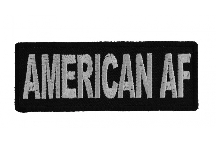 AMERICAN AF PATCH, American As Fuck measures 4x1.5 inches and is Embroidered in Black / White. The Small Patch can be sewn on or ironed on to clothing such as Denim or Leather Jackets, Vests, Hats, Back Packs, Shirts. Features plastic backing and embroidered die cut borders.