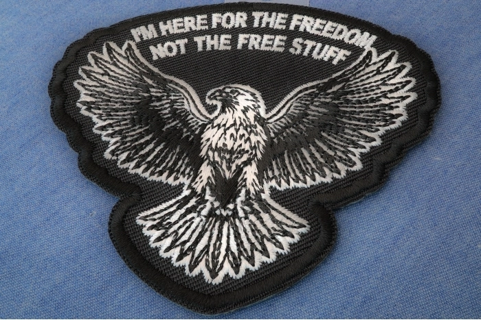 I'm here for the Freedom Not for the Free Stuff Patch measures 3.5x3.5 inches and is Embroidered in Black / White. The patch can be sewn on to Leather Biker Jackets, Vests or Chaps. The patch can also be ironed on to Shirts, Hats or Denim material such as Jeans. Features plastic iron on backing and clean laser cut embroidered borders. Japanese made iron on glue requires temperature between 270-290 Degrees Fahrenheit. Use a heat press for 30 seconds to adhere the patch permanently to your clothing. Using a regular household iron will probably not be as permanent as one hopes. If possible we recommend you sew on your patches for a more durable application. Never iron on patches to Leather or Nylon materials.