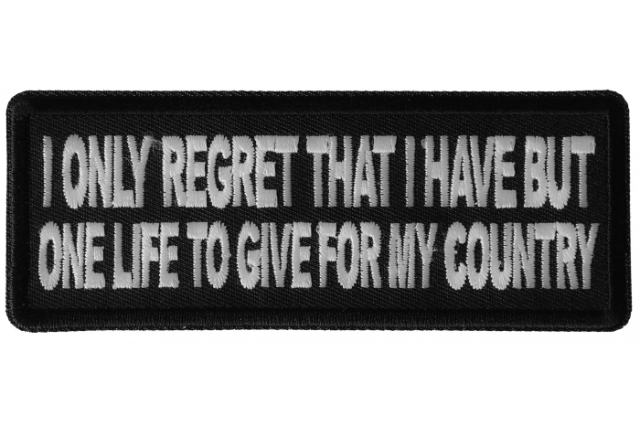 I only regret that I have but one Life to Give for My Country Patch measures 4x1.5 inches and is Embroidered in Black / White. The Small Patch can be sewn on or ironed on to clothing. You should sew patches on to leather jackets or vests. Refrain from ironing on patches to nylon or leather material. The correct iron on temperature is 270 degrees Fahrenheit. If you are using a household iron you should press down for 30 seconds. If you are using a heat press 12 seconds is sufficient. The patch features clean cut embroidered borders