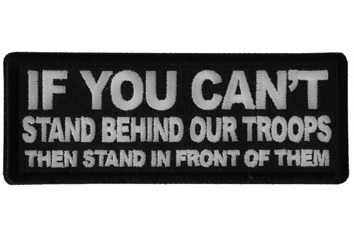 If You Can't Stand Behind Our Troops Then Stand in Front of Them Patch measures 4x1.5 inches and is Embroidered in Black / White. The Small Patch can be sewn on or ironed on to clothing. You should sew patches on to leather jackets or vests. Refrain from ironing on patches to nylon or leather material. The correct iron on temperature is 270 degrees Fahrenheit. If you are using a household iron you should press down for 30 seconds. If you are using a heat press 12 seconds is sufficient. The patch features clean cut embroidered borders