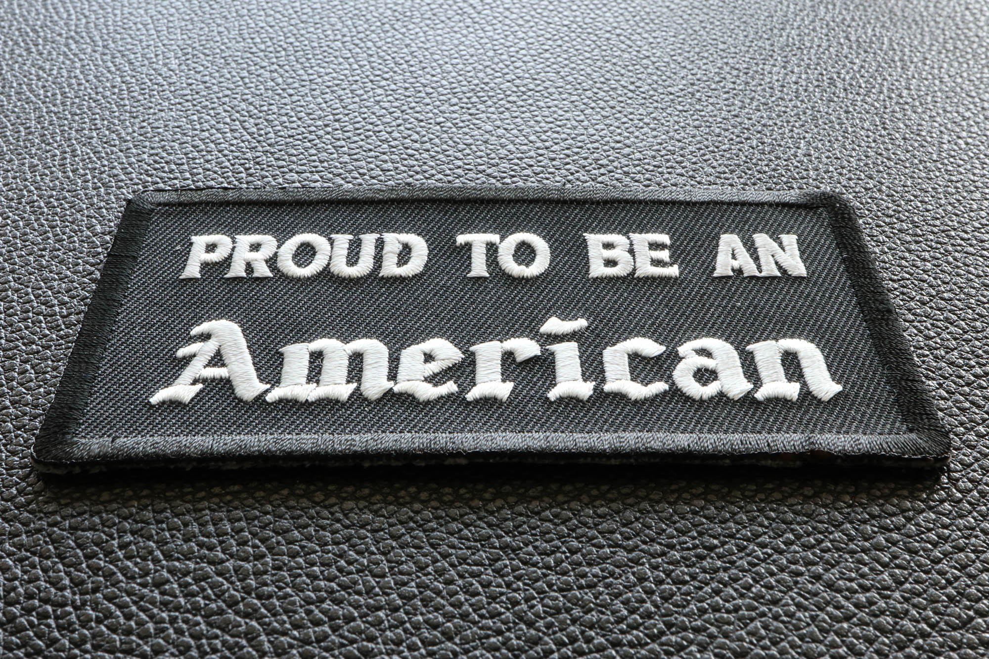 Proudly wear this embroidered patch on your jacket. Proud to be an American patch measures 4x2 inches. It is embroidered in white over Black.