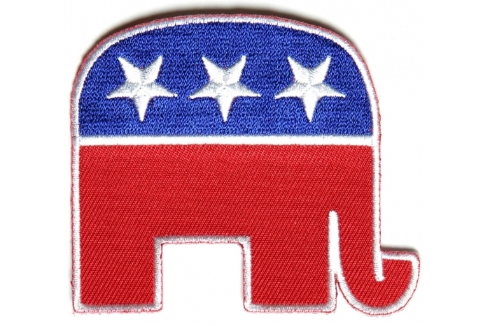 Republican Elephant Patch measures 3x2.7 inches and is Embroidered in Red / White / Blue. The Small Patch can be sewn on or ironed on to clothing such as Denim or Leather Jackets, Vests, Hats, Back Packs, Shirts. Features plastic backing and embroidered die cut borders.