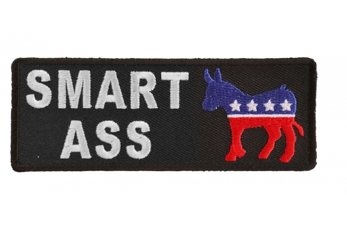 Smart Ass Patch Democratic Donkey measures 4x1.5 inches and is Embroidered in Black / White / Red / Blue. The Small Patch can be sewn on or ironed on to clothing such as Denim or Leather Jackets, Vests, Hats, Back Packs, Shirts. Features plastic backing and embroidered die cut borders.