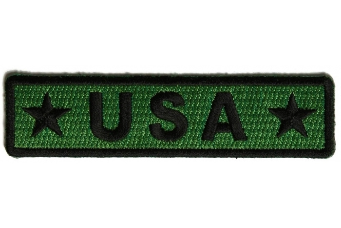 USA black and green patch measures 4x1 inches and is Embroidered in Black / Green. The Small Patch can be sewn on or ironed on to clothing such as Denim or Leather Jackets, Vests, Hats, Back Packs, Shirts. Features plastic backing and embroidered die cut borders.