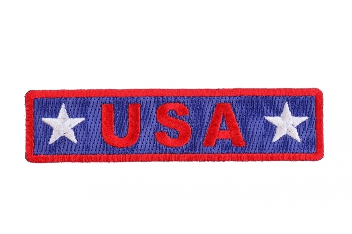 USA Red White Blue Patch measures 4x1 inches and is Embroidered in Red / White / Blue. The Small Patch can be sewn on or ironed on to clothing such as Denim or Leather Jackets, Vests, Hats, Back Packs, Shirts. Features plastic backing and embroidered die cut borders.