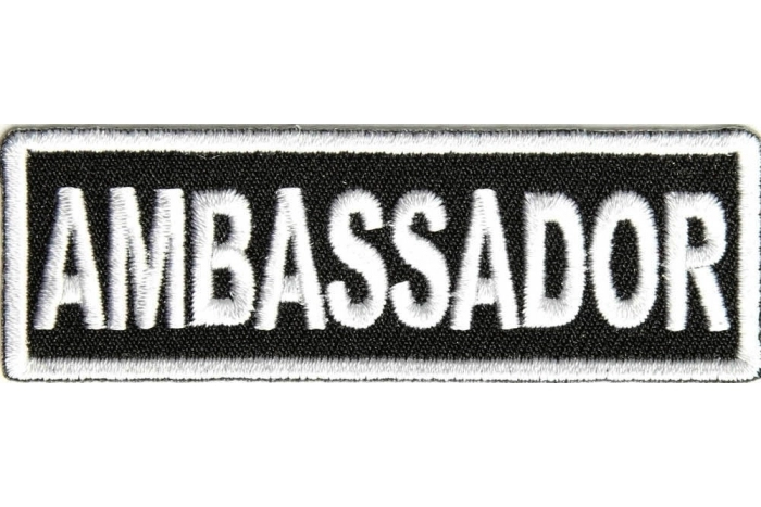 Ambassador patch measures 3x1 inches. Embroidered in white over black patch with white trim borders. For all ambassadors of motorcycle clubs.