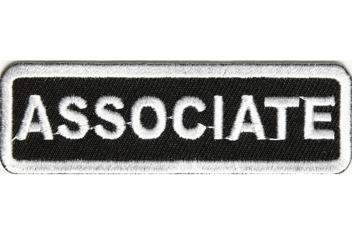 Club rank patch for associates. The iron on patch is embroidered in white over black and measures 3x1 inches. The patch features die cut borders for a clean look. You can sew it on to your leather vest or jacket, press it on to hats, shirts, jeans or belt. Make a Statement with patches.