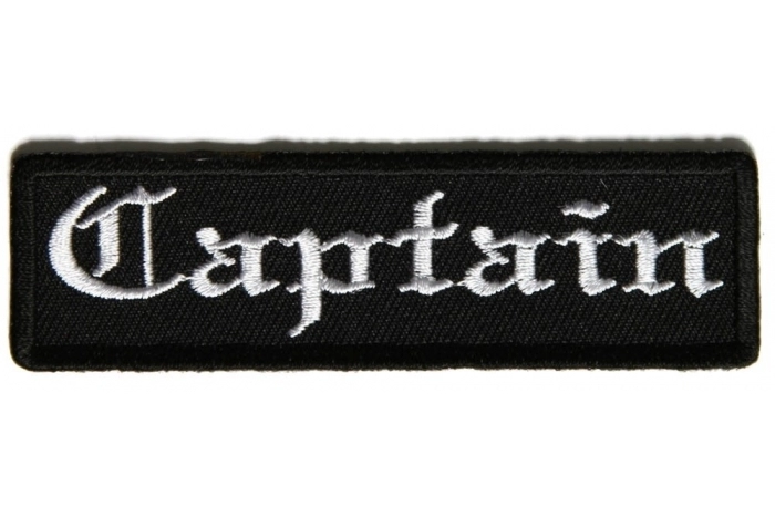 Captain Patch in Old English measures 3.5x1 inches and is Embroidered in Black / White. The Small Patch can be sewn on or ironed on to clothing such as Denim or Leather Jackets, Vests, Hats, Back Packs, Shirts. Features plastic backing and embroidered die cut borders.