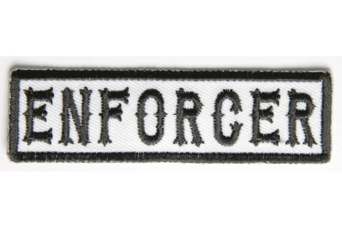 Enforcer Patch Black on White measures 3.5x1 inches and is Embroidered in White / Black. The Small Patch can be sewn on or ironed on to clothing such as Denim or Leather Jackets, Vests, Hats, Back Packs, Shirts. Features plastic backing and embroidered die cut borders.