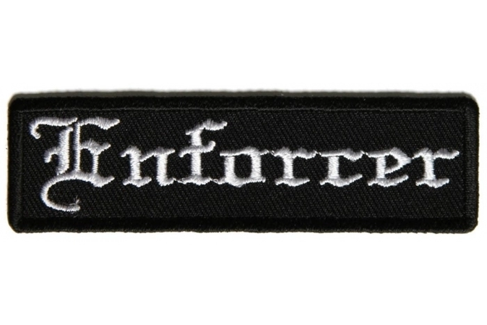 Enforcer Patch in Old English measures 3.5x1 inches and is Embroidered in Black / White. The Small Patch can be sewn on or ironed on to clothing such as Denim or Leather Jackets, Vests, Hats, Back Packs, Shirts. Features plastic backing and embroidered die cut borders.