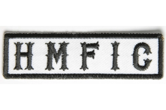 HMFIC Patch Black on White measures 3.5x1 inches and is Embroidered in White / Black. The Small Patch can be sewn on or ironed on to clothing such as Denim or Leather Jackets, Vests, Hats, Back Packs, Shirts. Features plastic backing and embroidered die cut borders.