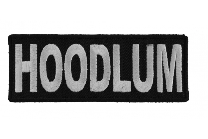 Hoodlum Patch measures 4x1.5 inches. Embroidered in white over black. Buy funny patches at The Cheap Place. Same day shipping.