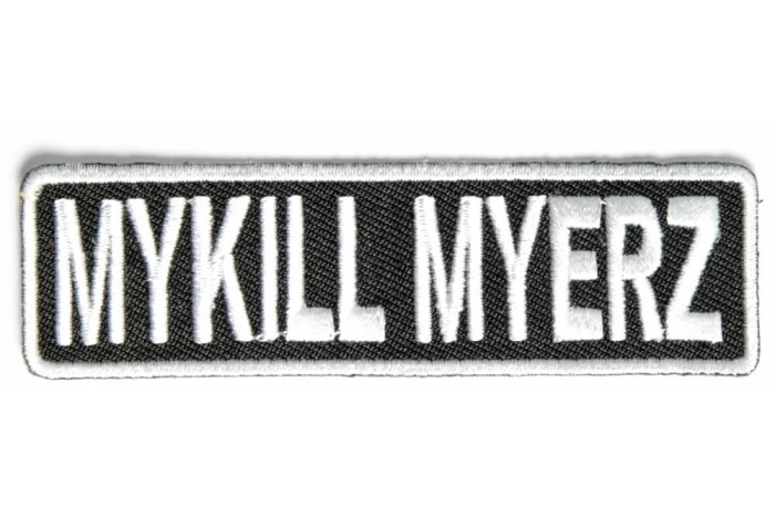 Mykill Myerz Patch is an embroidered iron on patch measuring 3.5x1 inch. Apply it to your clothing by sewing it on or ironing it on. The patch features die cut borders for easy sewing and iron on backing for easy iron on application. Please do not iron on patches to leather or nylon material. Please remember using a household iron will not produce professional results. Both heat and pressure is required to adhere an iron on patch properly to a garment.