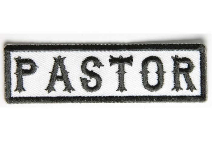 Pastor Patch Black on White measures 3.5x1 inches and is Embroidered in White / Black. The Small Patch can be sewn on or ironed on to clothing such as Denim or Leather Jackets, Vests, Hats, Back Packs, Shirts. Features plastic backing and embroidered die cut borders.