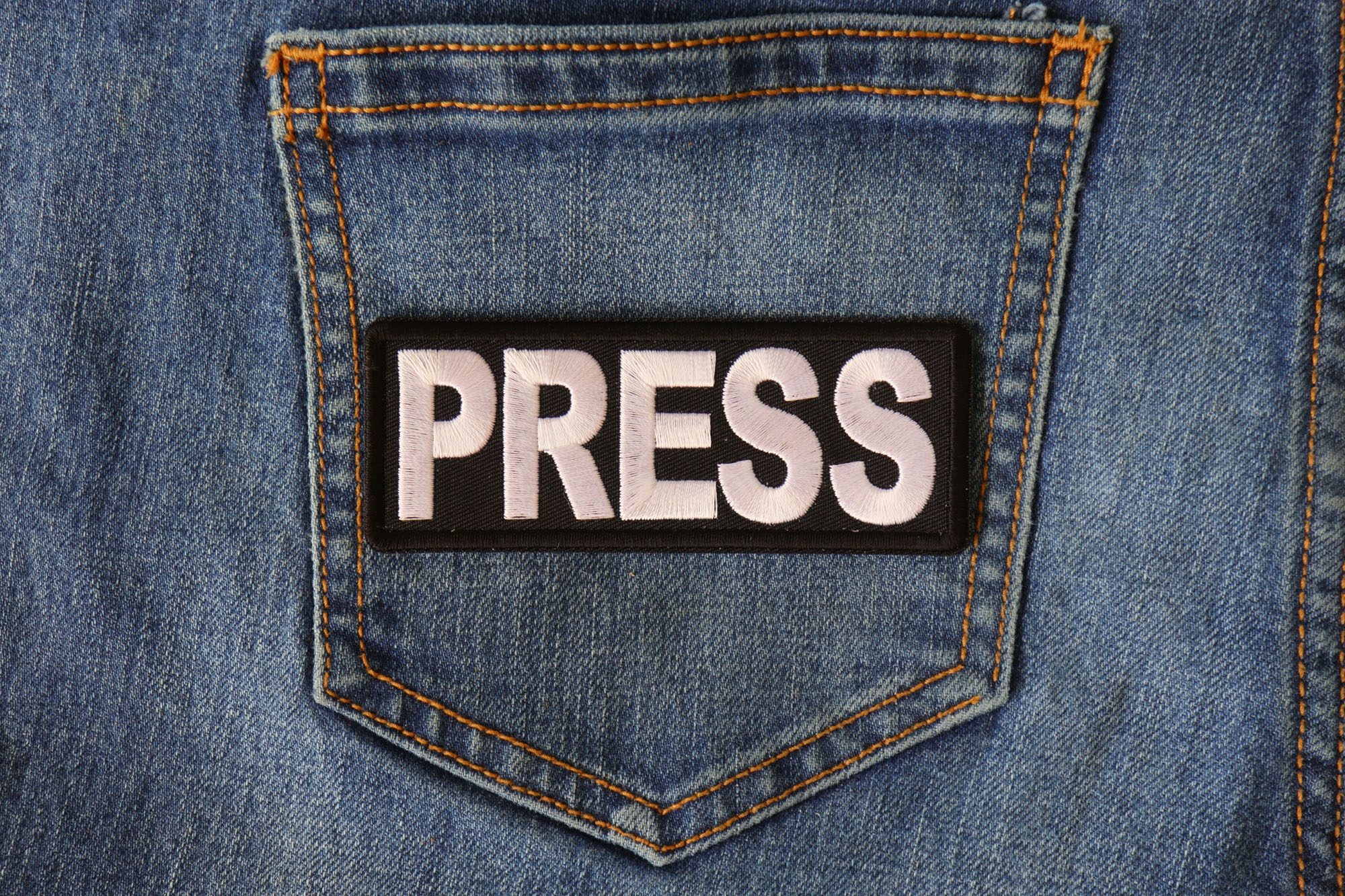 Press Patch measures 4x1.5 inches and is Embroidered in Black / White. The Small Patch can be sewn on or ironed on to clothing. You should sew patches on to leather jackets or vests. Refrain from ironing on patches to nylon or leather material. The correct iron on temperature is 270 degrees Fahrenheit. If you are using a household iron you should press down for 30 seconds. If you are using a heat press 12 seconds is sufficient. The patch features clean cut embroidered borders
