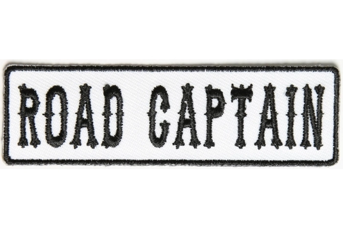 Road Captain Patch Black on White measures 3.5x1 inches and is Embroidered in White / Black. The Small Patch can be sewn on or ironed on to clothing such as Denim or Leather Jackets, Vests, Hats, Back Packs, Shirts. Features plastic backing and embroidered die cut borders.