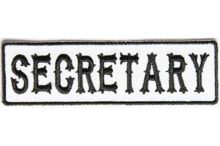 Secretary Patch Black on White measures 3.5x1 inches and is Embroidered in White / Black. The Small Patch can be sewn on or ironed on to clothing such as Denim or Leather Jackets, Vests, Hats, Back Packs, Shirts. Features plastic backing and embroidered die cut borders.