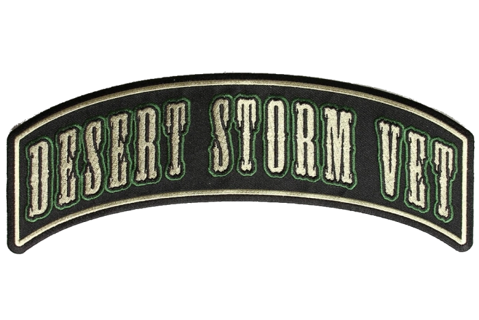 With stunning gold lettering surrounded by rich emerald green thread and set against a black background, the ‘Desert Storm Vet Rocker’ patch will look fantastic on the back of your clothing. If you served in the Gulf War as part of Desert Storm then this patch will take pride of place on your jacket or vest. It has been finished with thick die cut borders which give it a cleaner look and the embroidery is exquisite. The 4 x 10 inch patch can be ironed or sewn onto your clothing and the upwards arch of the patch means it will look best when placed at the top.