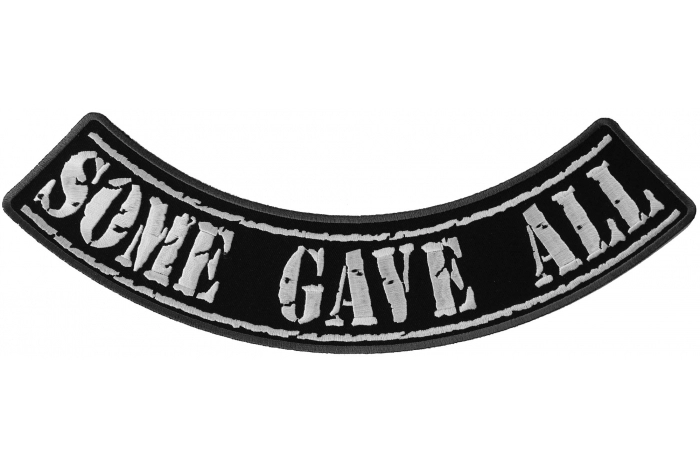 Some Gave All Large Lower Rocker Patch measures 12x2.5 inches and is Embroidered in Black / White. The Large Patch can be sewn on or ironed on to clothing such as Denim or Leather Jackets, Vests, Hats, Back Packs, Shirts. Features plastic backing and embroidered die cut borders.