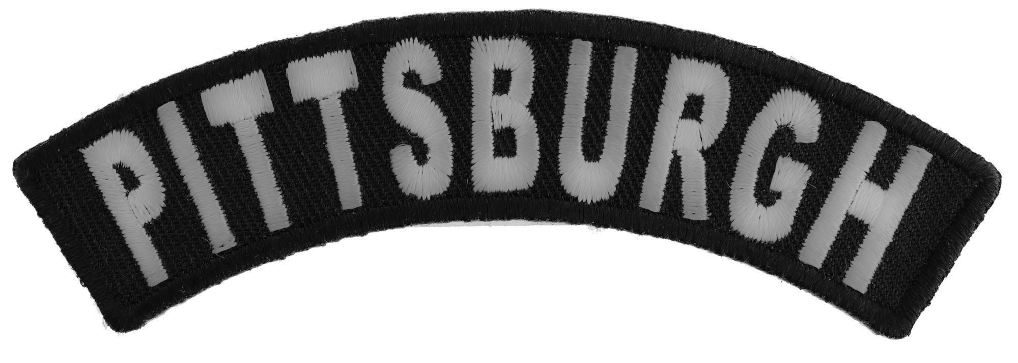Pittsburgh Patch measures 4 inches wide and is about an inch tall. Embroidered in white over black this city name rocker is designed to be sewn or ironed on the shoulders of your jacket or the front of your vest. Be proud of your local town, we've got quite a selection of different cities and we will add more in the future. We only stock these in small sizes, we do not have them available in large back patches. You can however purchase large blank rockers from us and have them embroidered at your local mall (usually you'll find someone at mall's doing embroidery on to hats, they can also embroider over our blank patches. We can make custom patches given you want at least 20 pieces of a design.