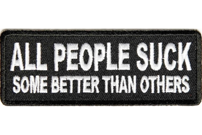 All People Suck, some better than others Patch. Embroidered with iron on backing. Measures 4x1.5 inches.