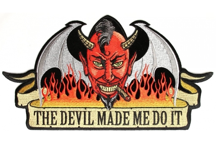 The patch is embroidered in multi colors. A red Devil head with cigar, silver wings and flames rising with the message that fits it perfectly "The Devil Made me Do it".