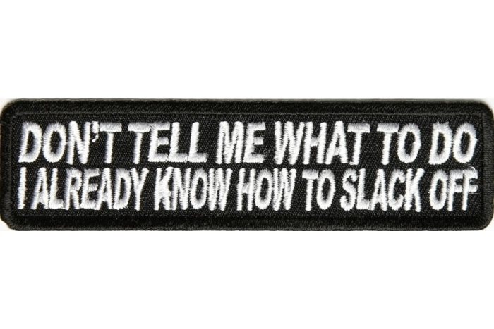 Don't tell me what to do, I already know how to slack off. The iron on patch is embroidered in white over black and measures 1x4 inches. The patch features die cut borders for a clean look. You can sew it on to your leather vest or jacket, press it on to hats, shirts, jeans or belt. Make a Statement with patches.