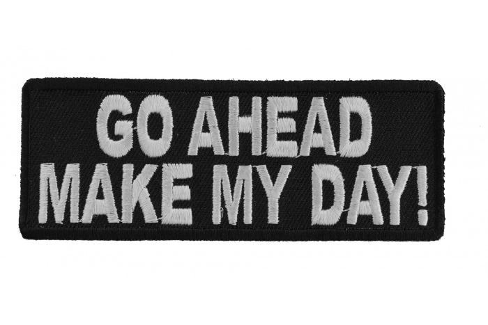 Go Ahead Make my day patch is embroidered in white over black. The iron on patch measures 4x1.5 inches.