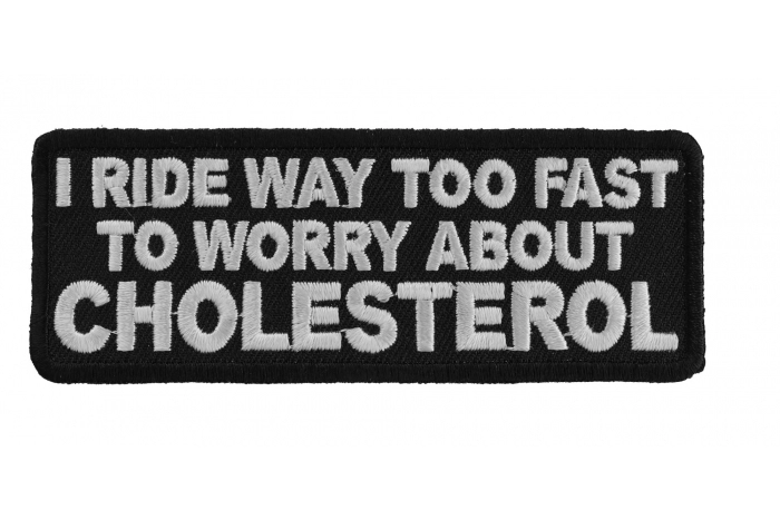 Cholesterol. What a jerk. If you ride too fast apparently it goes away. So if you ride too fast than you don't have to worry about it. Don't ask me if I'm serious. I haven't conducted a medical scientific experiment to see whether your cholesterol levels drop from the adrenaline rush of riding fast. All I know is the speed is going to send me 6 feet under before the cholesterol does. So I'm not worried about it. The patch is embroidered in white over black. Nice clean borders that are die cut and iron on backing for easy ironing on to your clothes. Just be sure to sew it on if it is going on any type of leather including leather jackets, vests or even suede. You don't want the hot iron damaging your leather. Measures 4x1.5 inches in size.