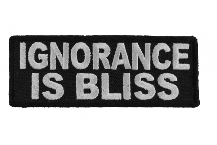 Ignorance is Bliss. Sometimes the less you know the better off you are, the patch measures 4x1.5 inches and is embroidered in white over black.