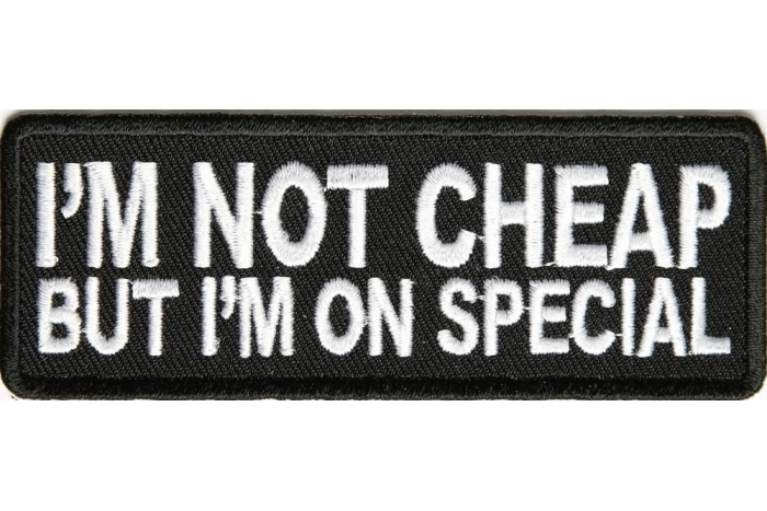 If you think you are not Cheap but can be on special for the right kind of fun than have this embroidered funny patch installed on your vest, or wallet! Measures 4x1.5 inches so it can fit almost anywhere. Features die cut borders and heat seal backing for easy iron on application as well.
