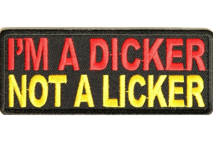 This funny patch that says "I'm a dicker not a licker". Measures 4x1.5 inches. Embroidered in red and yellow. There is also another version of it that says I'm a licker not a dicker.
