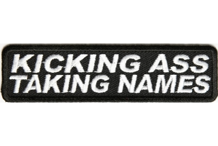 A patch for those who are kicking ass and taking names. The iron on patch is embroidered in white over black and measures 4x1 inches. The patch features die cut borders for a clean look. You can sew it on to your leather vest or jacket, press it on to hats, shirts, jeans or belt. Make a Statement with patches.