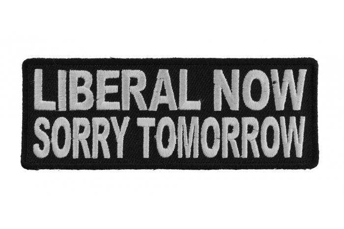 Liberal Now, Sorry Tomorrow patch is embroidered in white over black and measures 4x1.5 inches. A reminder to those who think Libereal, Act Liberal, and end up being sorry for it a decade later.
