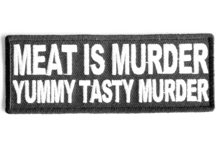 This patch declares Meat is Murder. Than goes on about detailing it that it is yummy tasty murder. Measures 4x1.5 inches.