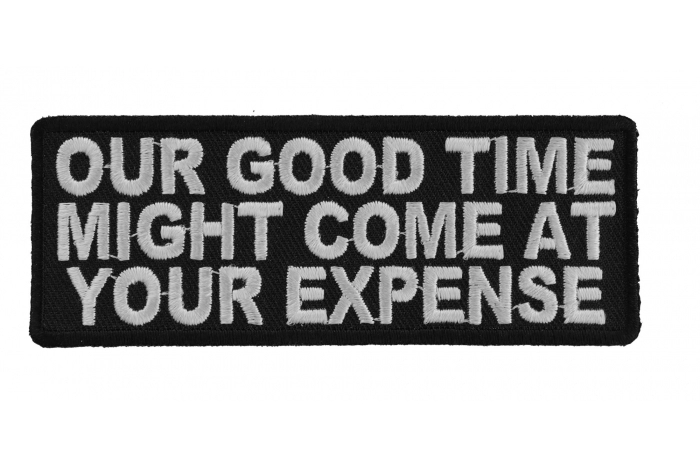 Our Good time might come at your expense patch measures 4x1.5 inches. The iron on patch is Embroidered in white over black.