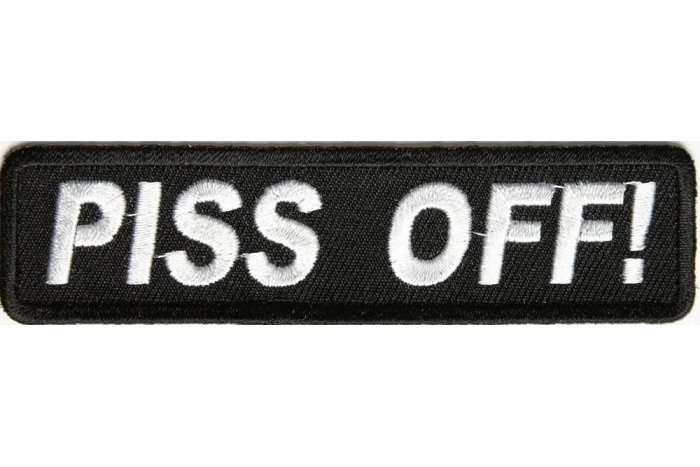 Tell them to piss off with this patch. The iron on patch is embroidered in white over black and measures 1x4 inches. The patch features die cut borders for a clean look. You can sew it on to your leather vest or jacket, press it on to hats, shirts, jeans or belt. Make a Statement with patches.